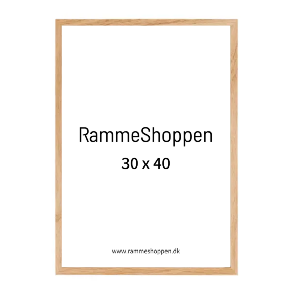 Massiv egetræsramme til 30x40 indhold. Rammen har monteret ophængsbeslag på bagpladen.