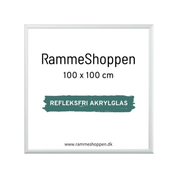 100x100-billedrammen har monteret ophængsfjeder-klemmer med øjer. Den er derved ganske enkel at hænge vandret og/eller lodret på den udsete plads.