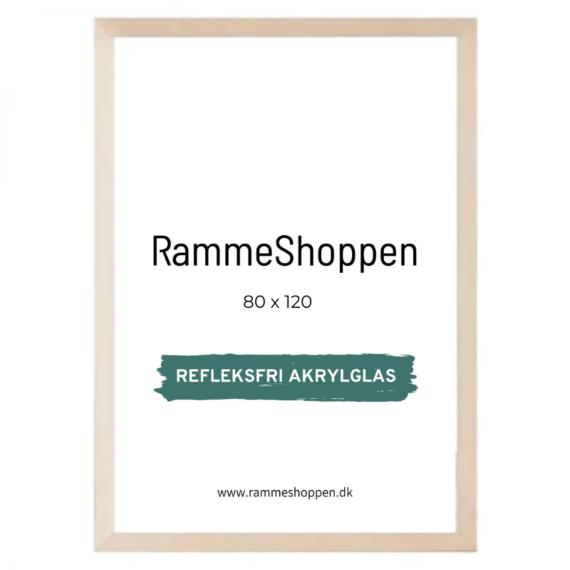 Denne ramme er i birketræ med smal rammeliste og med frontglas i refleksfri akryl. Rammen ophænges nemt med de monterede beslag på rammens bagplade.